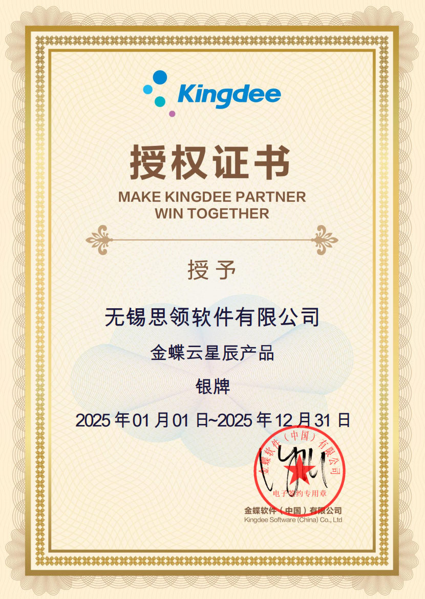 作为金蝶授权的铂金合作伙伴,无锡思领连续多年荣获“金蝶云星空精英伙伴”称号,业绩位居江苏省第一,具备强大的产品交付与服务体系。
