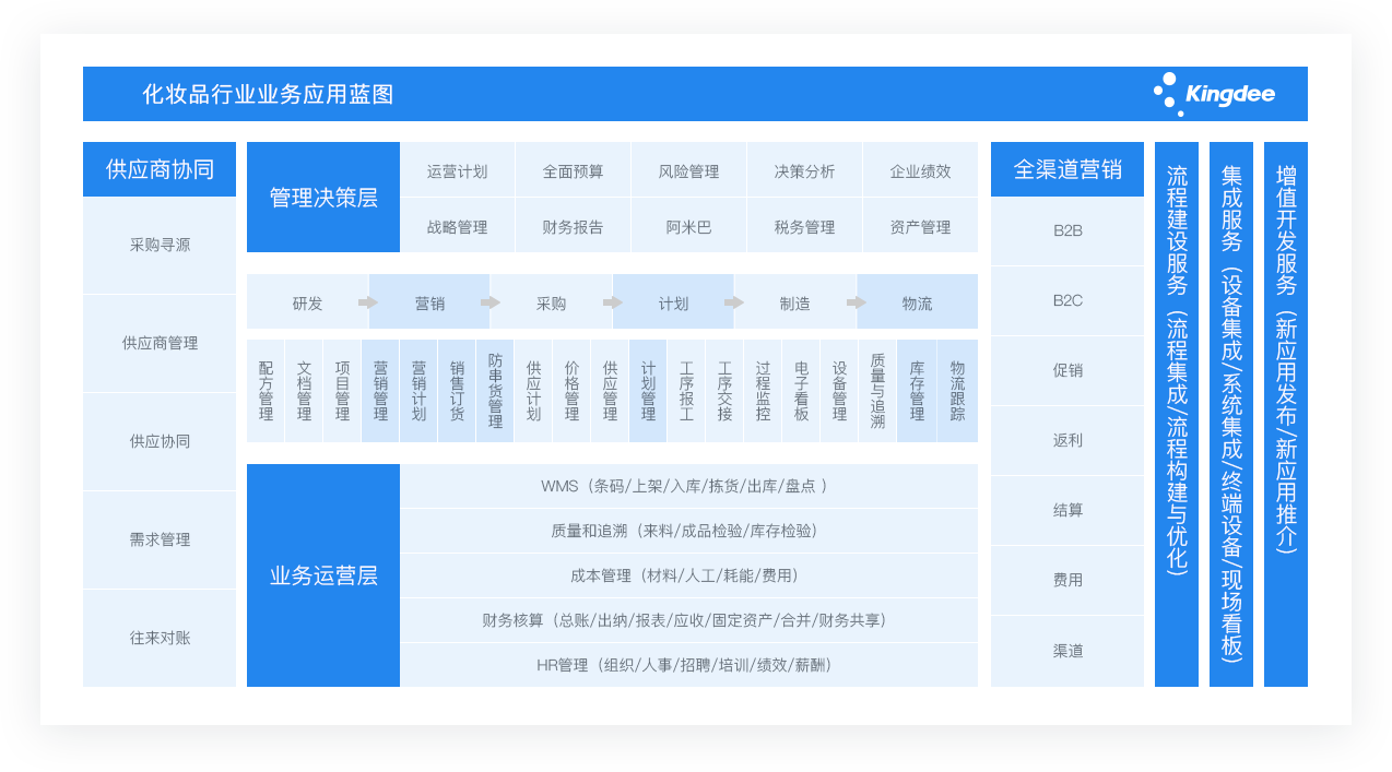 进一步地提升了化妆品企业的精细化管理,加强了组织间协同,快速响应市场需求,创新零售模式,拓宽了企业销售通路,为化妆品企业的快速发展提供了数字化支撑