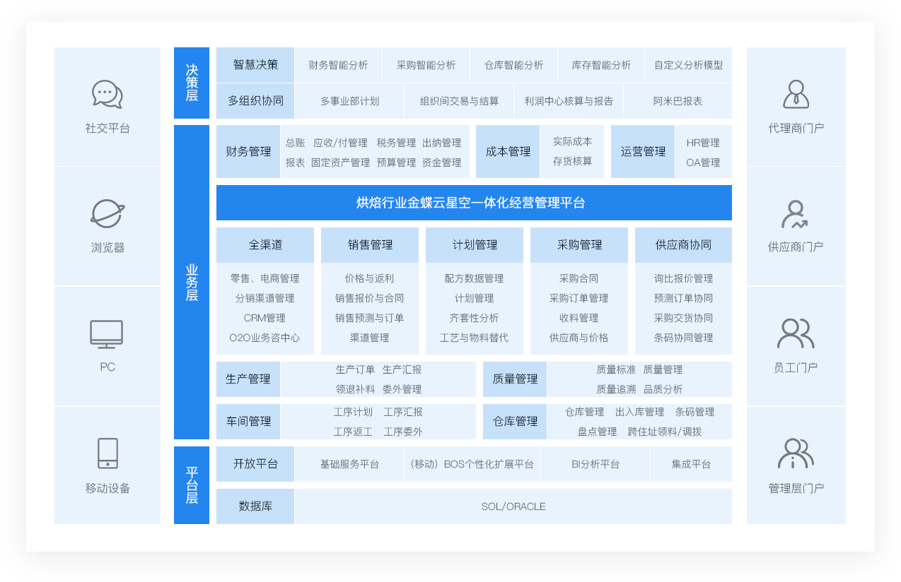 基于对烘焙连锁行业长期、深入的调研和细致的业务流程梳理之后,为烘焙连锁企业量身定制信息化管理平台。保证企业内部信息的准确传递,以即时数据把握行业与季节性市场动向,协助企业快速、准确做出市场战略决策,与消费者、经销渠道建立实时、用心的互联,为企业打造快捷、高效、实时、精准、灵活的烘焙行业信息管理服务平台